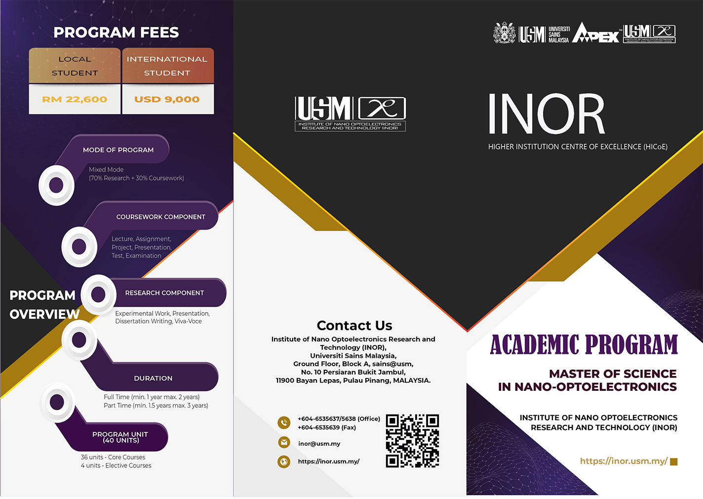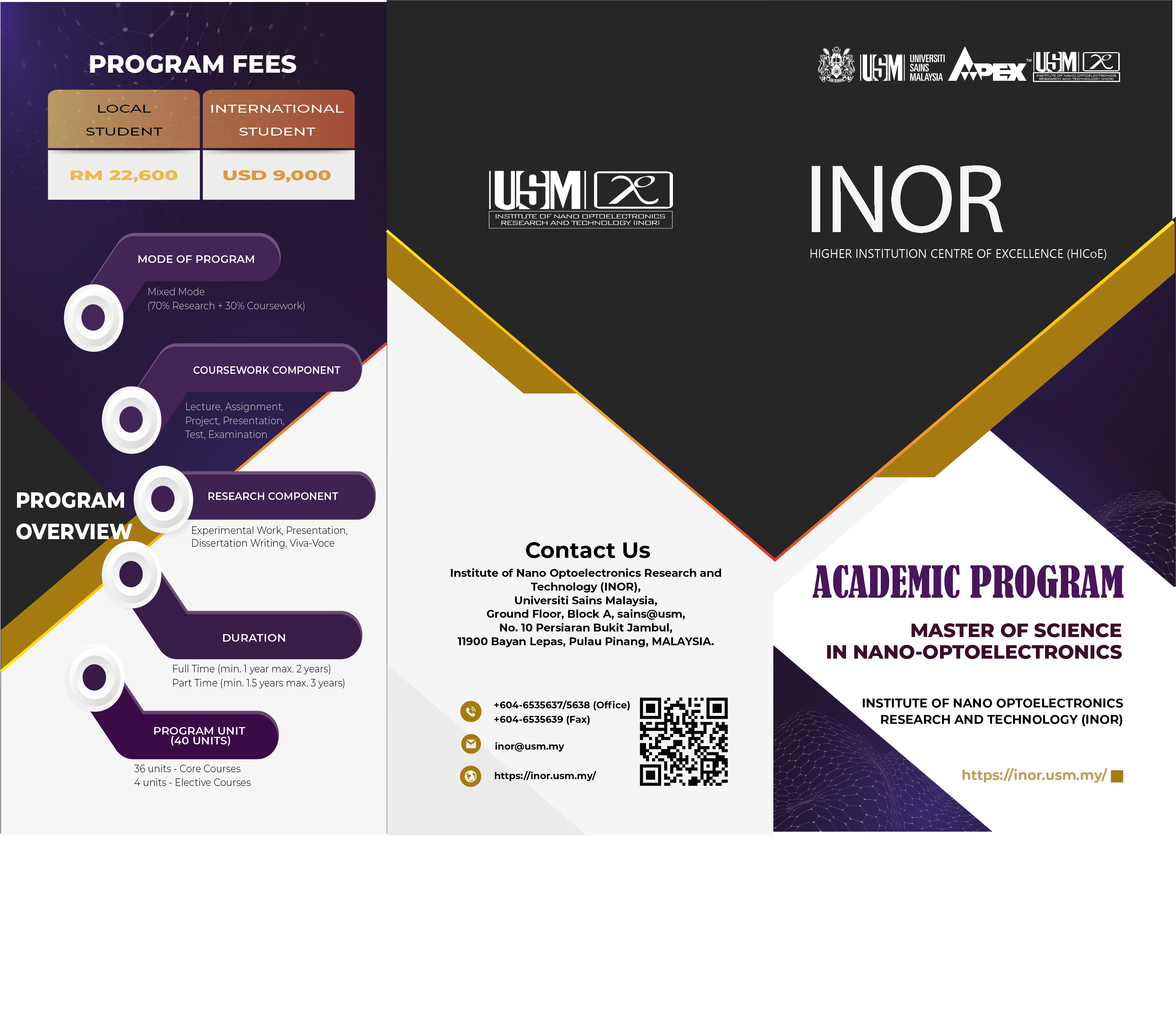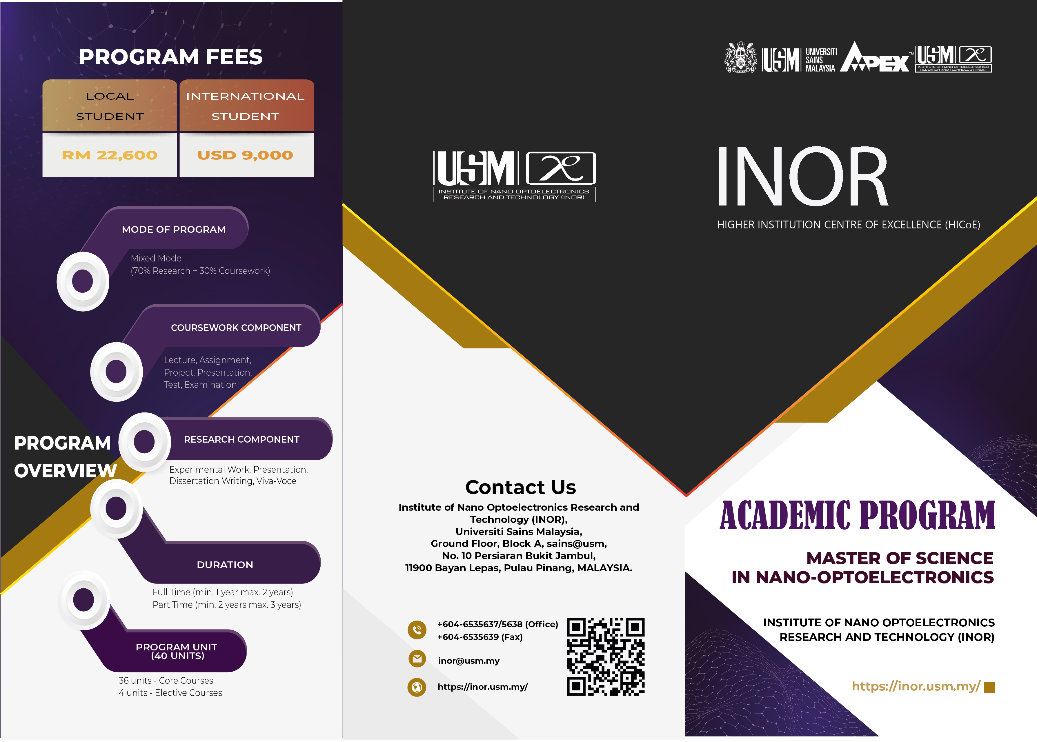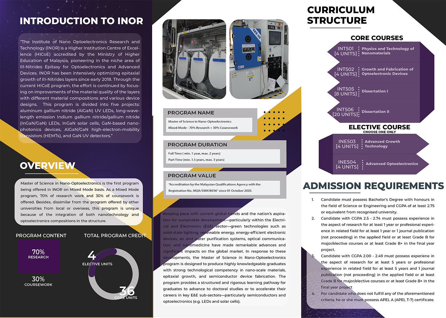 Master of Science in Nano-Optoelectronics is the first program being offered in INOR on Mixed Mode basis. As a MixedMode program,70% of research work and 30% of coursework  is offered. Besides, dissimilar from the program offered by other universities from local or overseas, this program is  unique because of the integration of both nanotechnology and optoelectronics compositions in the structure.